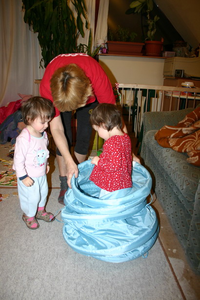 Nagyival nagyon jól eljátszanak a Lányok, aki kapható is mindenféle játékra. Amíg nem tudtak egyedül menni, ő volt az, aki fáradhatatlanul rótta velük a köröket, felváltva hol az egyikkel, hol a másikkal, aztán mind a kettővel, amikor már tudtak úgy is menni. Most pedig már rendesen lehet velük játszani. A következő fokozat szerintem az lesz, amikor a Nagyi elviszi őket is tornázni. :)